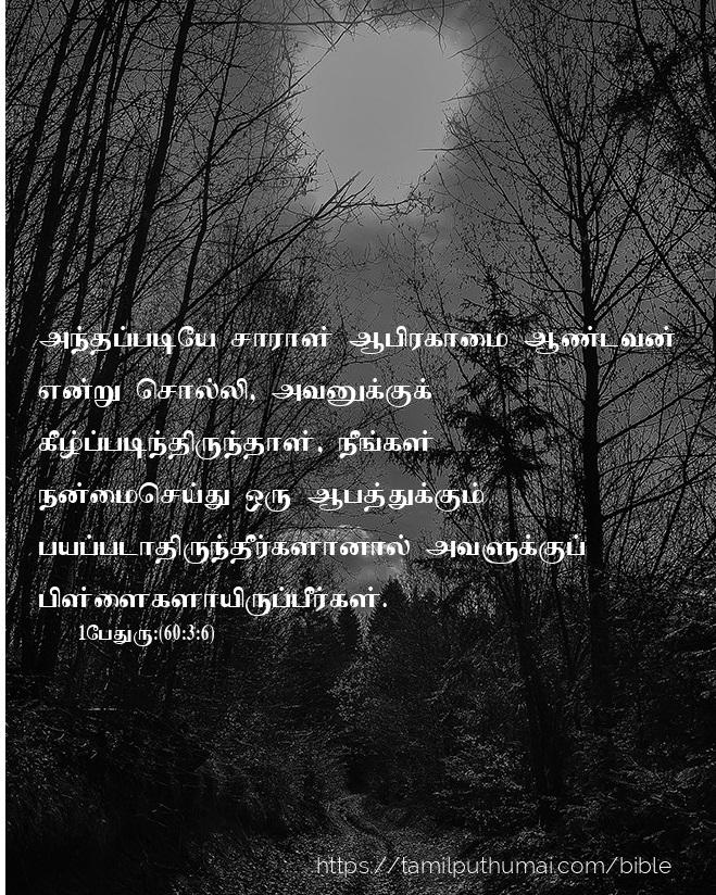 அந்தப்படியே சாராள் ஆபிரகாமை ஆண்டவன் என்று சொல்லி, அவனுக்குக் கீழ்ப்படிந்திருந்தாள், நீங்கள் நன்மைசெய்து ஒரு ஆபத்துக்கும் பயப்படாதிருந்தீர்களானால் அவளுக்குப் பிள்ளைகளாயிருப்பீர்கள்.