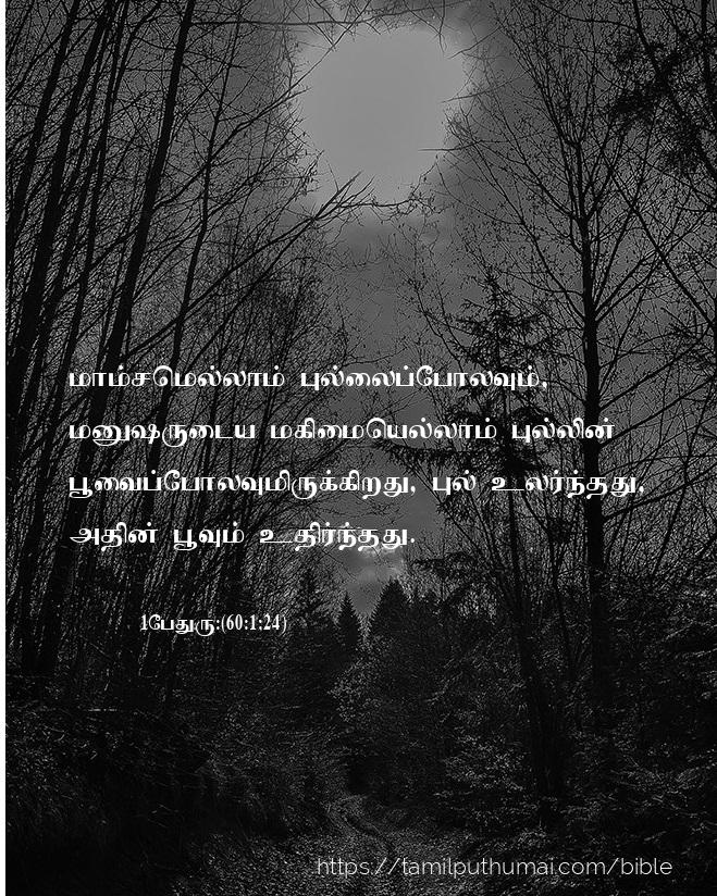 மாம்சமெல்லாம் புல்லைப்போலவும், மனுஷருடைய மகிமையெல்லாம் புல்லின் பூவைப்போலவுமிருக்கிறது, புல் உலர்ந்தது, அதின் பூவும் உதிர்ந்தது.