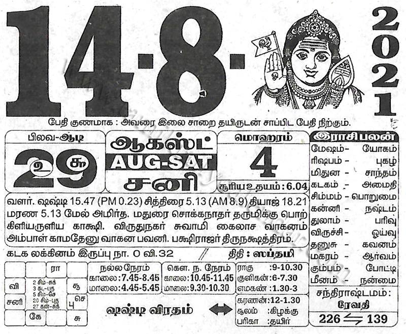 தமிழ் நாட்காட்டி 2021-08-14 சனிக் கிழமை