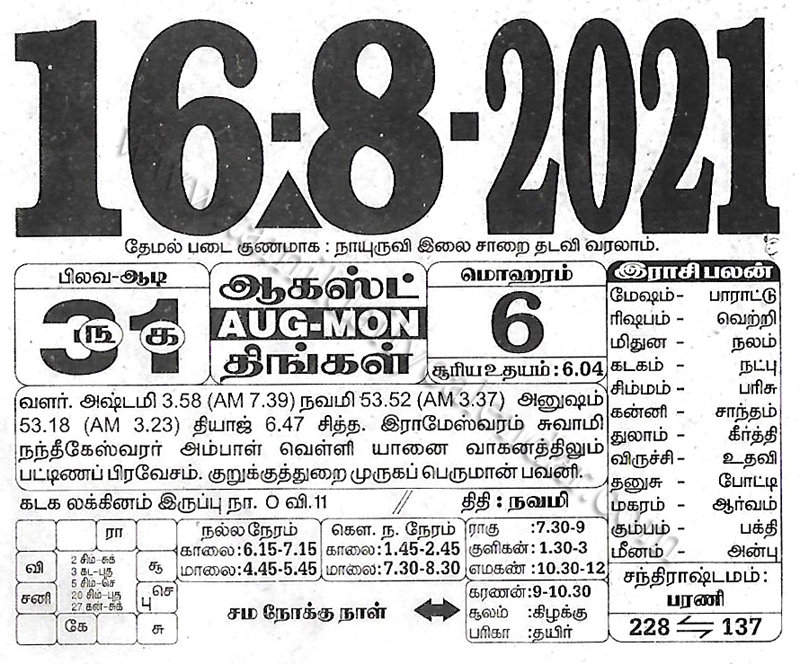 தமிழ் நாட்காட்டி 2021-08-16 திங்கட் கிழமை