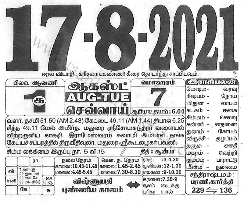 தமிழ் நாட்காட்டி 2021-08-17 செவ்வாய்க் கிழமை