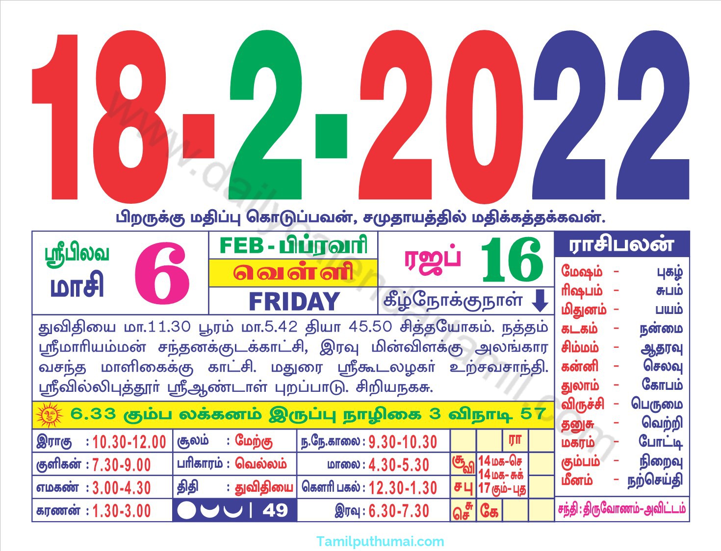 தமிழ் நாட்காட்டி 2022-02-18 வெள்ளிக்கிழமை